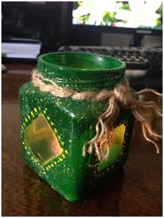 حالا میتوانید دور قسمتهای خالی را با رنگ دیگری (مثلا طلایی) مدل بدهید. دور گردن شیشه را تکه ای روبان یا کنف گره بزنید و درون شیشه شمعِ وارمر بگذارید .
